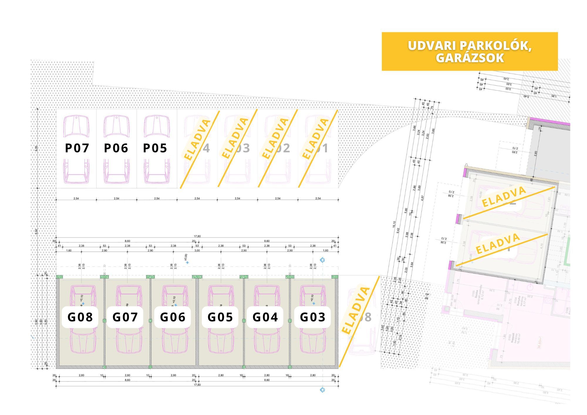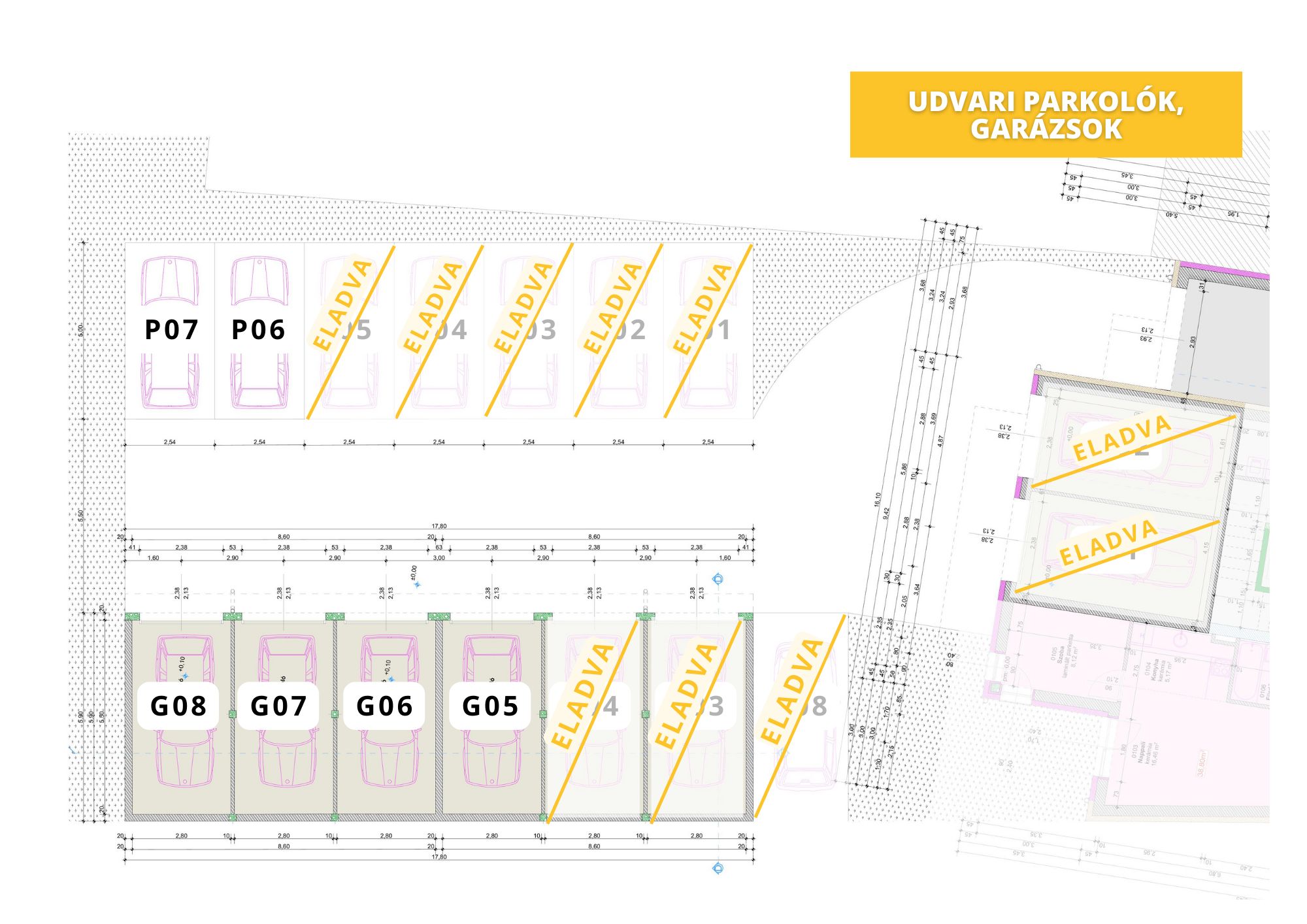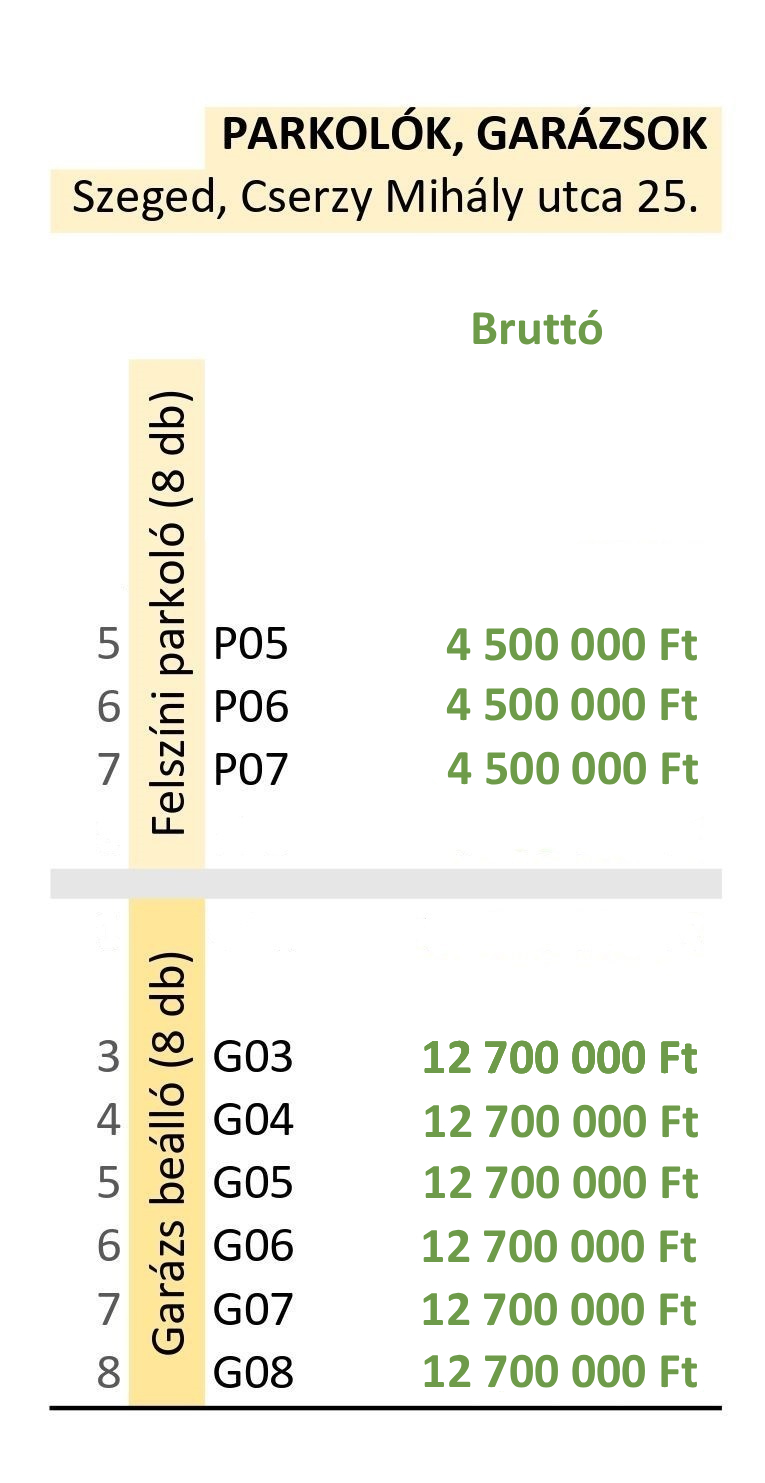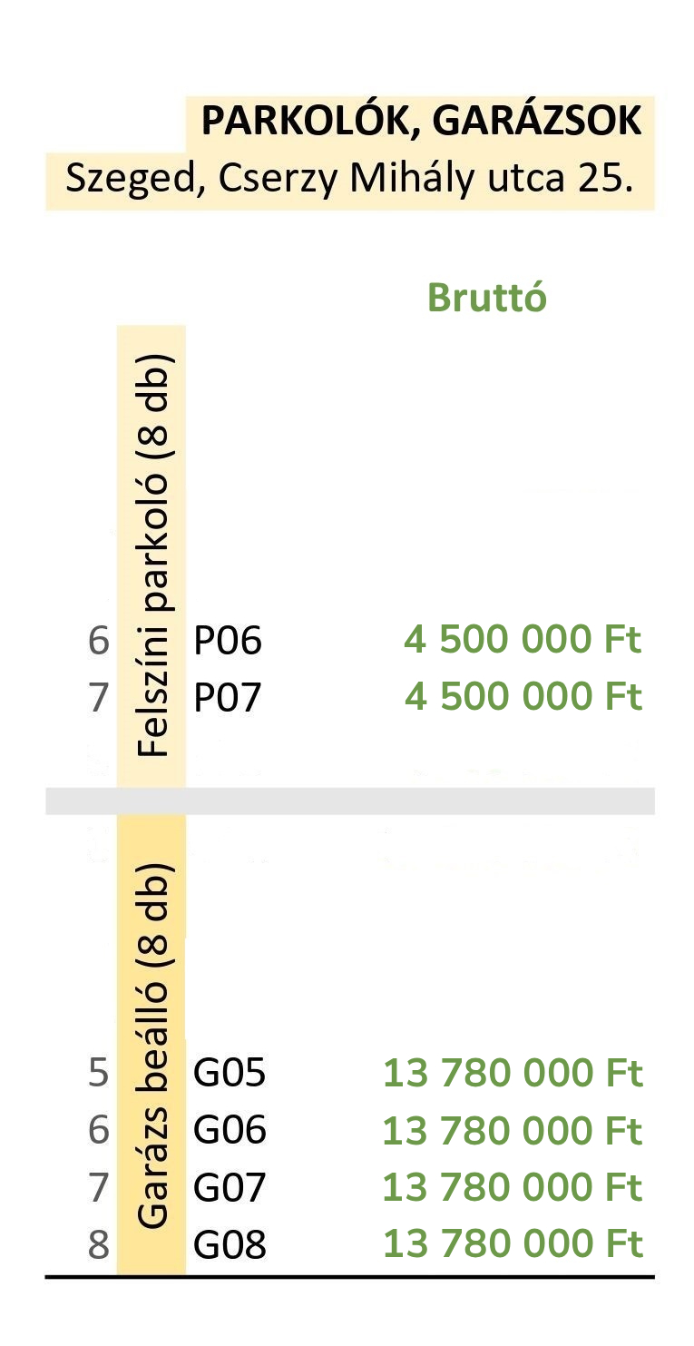 Parkolók és Garázsok opciónálisan vásárolhatók a lakásokhoz. A parkolókat a lakásokhoz rendeljük kizárólagos használati joggal. A garázsok önnálló albetéttel kerülnek értékesítésre.